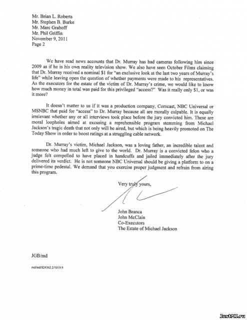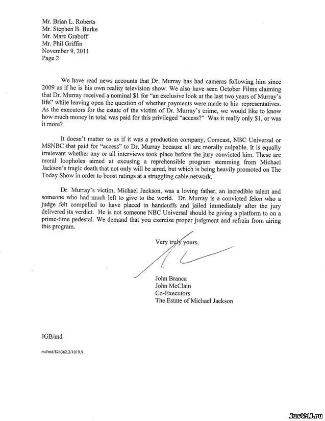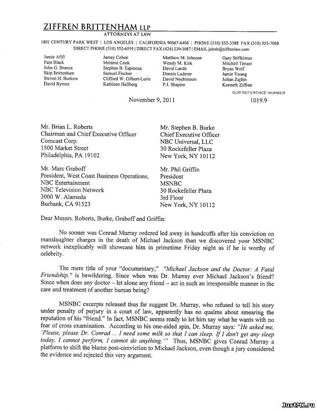 Letter by John Branca and John McClain to Comcast, NBC and MSNBC Письмо Фонда наследия руководителям Comcast, NBC Universal, NBC Television Network и MSNBC 10.11.11