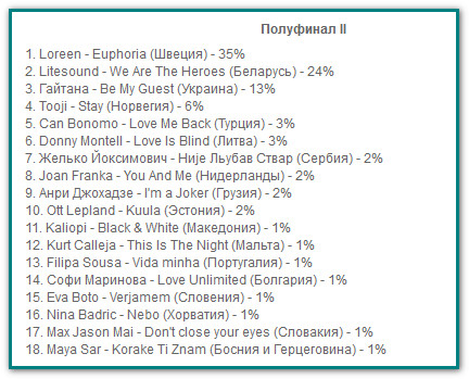 Как сообщалось, победительницей второго полуфинала также была Лорин. В первом полуфинале победили "Бурановские бабушки" из России.