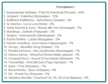 «Бурановские бабушки», представляющие Россию на «Евровидении-2012» в Баку, прошли с песней Party for Everybody «Праздник для всех» в финал конкурса, который пройдет 26 мая. По итогам голосования они заняли девятое место среди 10 первых финалистов конкурса. Помимо России в финал вышли представители Румынии, Молдавии, Исландии, Венгрии, Дании, Албании, Кипра, Греции, Ирландии.