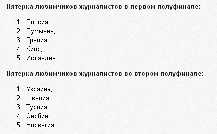 Первый полуфинал конкурса песни «Евровидение 2012» состоится уже сегодня в Баку. И пока поклонники гадают, кто же станет лидером и пройдет финал, журналисты уже определились со своим выбором и составили рейтинг.