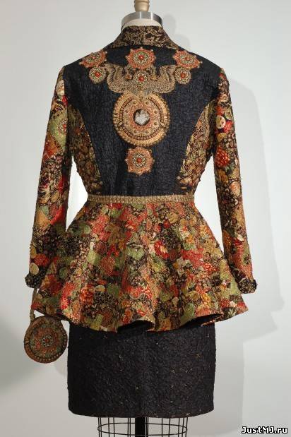 Пиджак был сшит из 36 крэйзи-квилт блоков и вручную расшит декоративными старинными золотыми бусинами и другими украшениями. Платье без бретелек было сконструировано из более чем 900 двух-дюймовых квадратов и простегано блестящей бронзовой нитью.