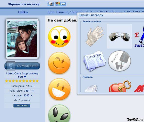 | Обновлений JustMJ.ru Информация о изменениях и обновлениях нашего сайта Для комментариев, вопросов, пожеланий и критики - воспользуйтесь темой Жалобы / Мнения / Отзывы С этого дня наград в виде сообщений форума больше не будет. Награждать участников можно будет только в профиле пользователя Так же появился ТОП 100 http://justmj.ru/index/top100/0-72