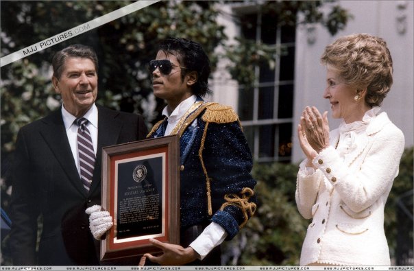 Из книги Рэнди Тараборрелли) Весной 1984 года Джону Бранка позвонила секретарь Комитета транспорта Элизабет Доул и спросила, не согласится ли Майкл на использование песни Beat It в качестве музыкального сопровождения для ТВ- и радио-рекламы, агитирующей против вождения в нетрезвом виде. Бранка сообщил об этом Майклу. «Это пошло, — ответил тот. — Я не могу». Бранка сказал, что отзвонит Доул и передаст, что они не заинтересованы. Но тут у Майкла появилась идея. — А знаешь что? — произнес он задумчиво. — Если я получу какую-нибудь награду от Белого дома, тогда я дам им песню. Как тебе такая мысль? — И уже с энтузиазмом добавил: — Разузнай, о чем с ними возможно договориться. — А чего бы тебе хотелось? — с удивлением спросил Бранка. — Ну… — начал Майкл, как ребенок, составляющий wish list. — Я хочу побывать в Белом доме, постоять на сцене рядом с Рональдом Рейганом и получить от него награду. И, конечно, я хочу познакомиться с Нэнси. Все по полной программе. Почему бы и нет? Ты же можешь это устроить, Бранка. Договоришься с президентом о награде? Джон усмехнулся: — Ну что ж, попробую. На следующий день он приступил к реализации проекта: позвонил Элизабет Доул и сказал, что она сможет получить песню для своей кампании, если придумает какую-нибудь гуманитарную награду для Майкла. Она согласилась. Согласились также президент и первая леди. Награждение было назначено на 14 мая 1984 года. Событие обещало быть захватывающим. Таких приготовлений и суматохи в Белом доме не было, наверное, с тех пор, как заложники из Ирана вернулись домой. По такому случаю, президент был в синем морском кителе, белой рубашке и синем в полоску галстуке. Нэнси блистала в роскошном белом костюме от Адольфо, украшенном золотыми пуговицами и золотой цепочкой. Но ее наряд едва ли имел значение, потому что в тот день все присутствующие бледнели в сравнении с Майклом Джексоном. Он появился в ослепительно-голубом мундире с золотыми эполетами, золотой перевязью и золотым поясом. И, конечно, в «фирменной» белой перчатке, украшенной камнями. Сотни сотрудников Белого дома (многие из них вооружившись фотоаппаратами) собрались на залитом солнцем газоне, чтобы хоть одним глазком взглянуть на Джексона. За сотню ярдов от главной сцены, вокруг ограды Белого дома плотной стеной стояли поклонники Майкла, некоторые — в одной белой перчатке, такой же, как у него. Две тысячи человек приветствовали Рональда Рейгана, Нэнси и Майкла, вышедших на сцену, оборудованную на южной лужайке Белого дома. Белый дом.14 мая 1984 Президент Рональд Рейган: Ну, разве это не триллер? [Смеется] Я очень рад видеть всех вас здесь сегодня. Мы не видели столько людей, с тех пор как мы покинули Китай. И так же, думаю, вы все пришли ко мне. [Смеется] Нет, я знаю, почему вы здесь, и не без оснований - увидеть одного из самых талантливых, самых популярных и наиболее интересных суперзвезд в музыкальном мире - Майкла Джексона. И, Майкл, добро пожаловать в Белый дом. Я надеюсь, ты простишь меня, но у нас есть немало молодых людей в Белом доме, кто хотел бы передать тебе свои сообщения. Они сказали, чтобы я передал Майклу:`` Пожалуйста, дайте немного нежности и заботы для PYT(Pretty Young Thing Молоденькая хорошенькая штучка – название песни Майкла).''[Смеется] Теперь я знаю, это звучит немного со стены (Off the wall название песни Майкла), но вы знаете, что я имею в виду. [